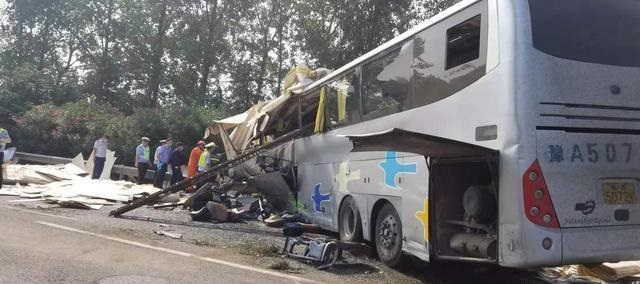 9月28日7時(shí)許,—輛由南向北行駛的車(chē)牌號為豫A5072V的大客車(chē)(核載69人,實(shí)載69人)在行至該路段時(shí),沖破道路中央隔離帶駛入對向車(chē)道,與一輛由北向南行駛的車(chē)牌號為蘇CF3658的半掛貨車(chē)(貨車(chē)上有3人)相撞。經(jīng)8個(gè)多小時(shí)的搜救,傷員已被送往宜興市定點(diǎn)救治醫院進(jìn)行救治。截止目前,事故造成了36人死亡,36人受傷,其中9人重傷,1人出院,經(jīng)初步勘察,事故系大客車(chē)左前輪爆胎所致,現場(chǎng)事故之慘烈讓人痛惜。
